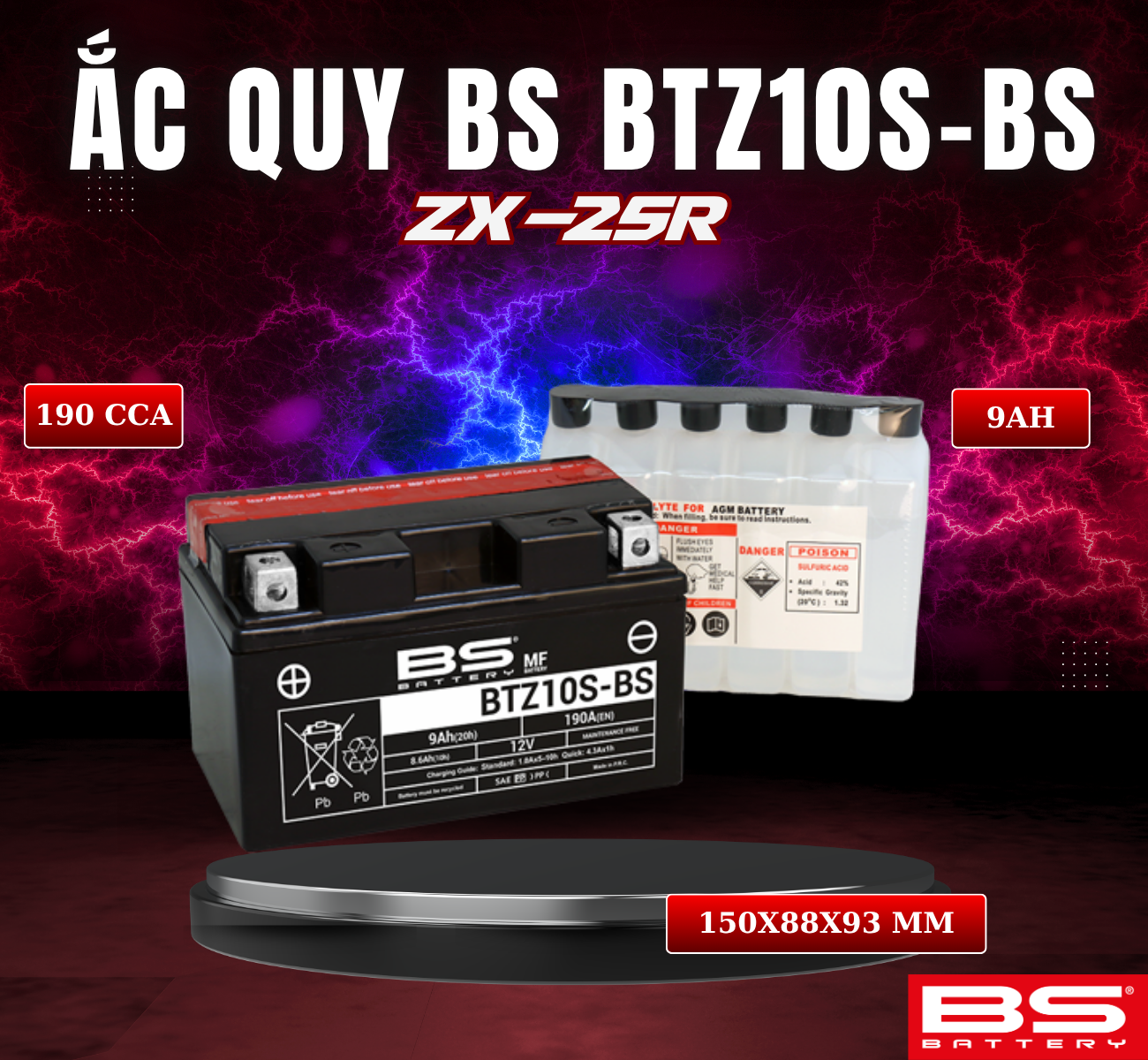 BÌNH ẮC QUY BS BATTERY BTZ10S-BS 190CCA KAWASAKI ZX-25R (150 x 88 x 93 mm)