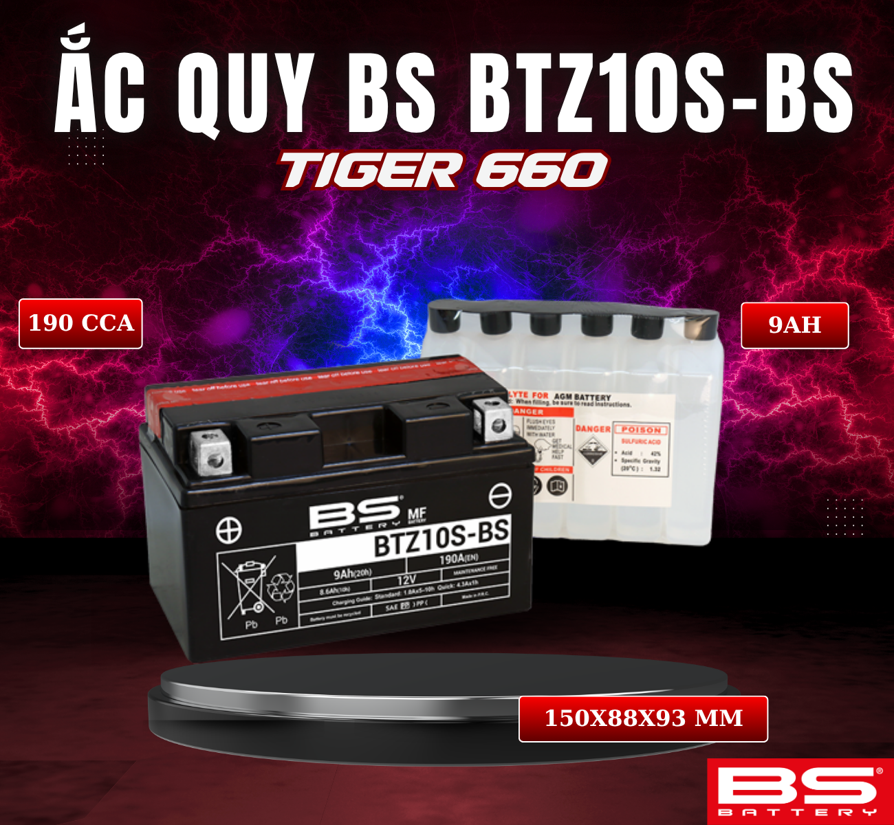 BÌNH ẮC QUY BS BATTERY BTZ10S-BS 190CCA TRIUMPH TIGER 660 (150 x 88 x 93 mm)