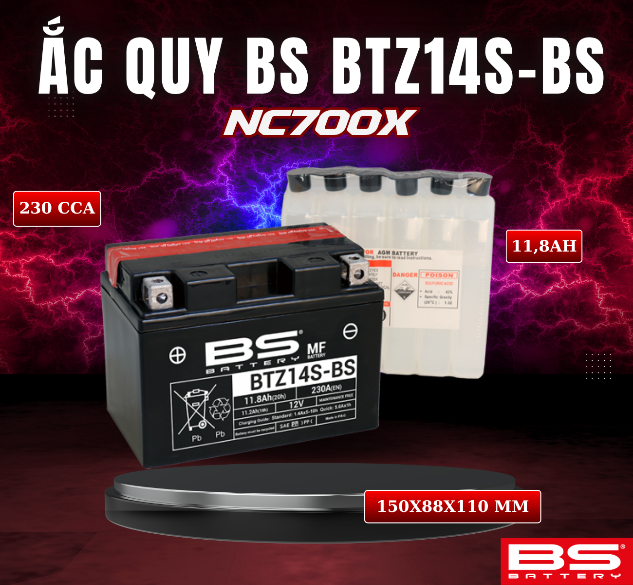 BÌNH ẮC QUY BS BTZ14-BS 230CCA HONDA NC700X(150x87x130 mm)