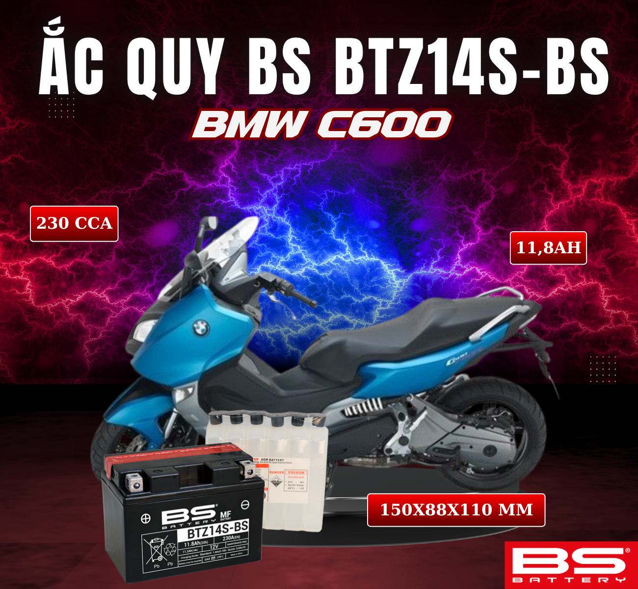 BÌNH ẮC QUY BS BTZ14-BS 230CCA BMW C600(150x88x110 mm)