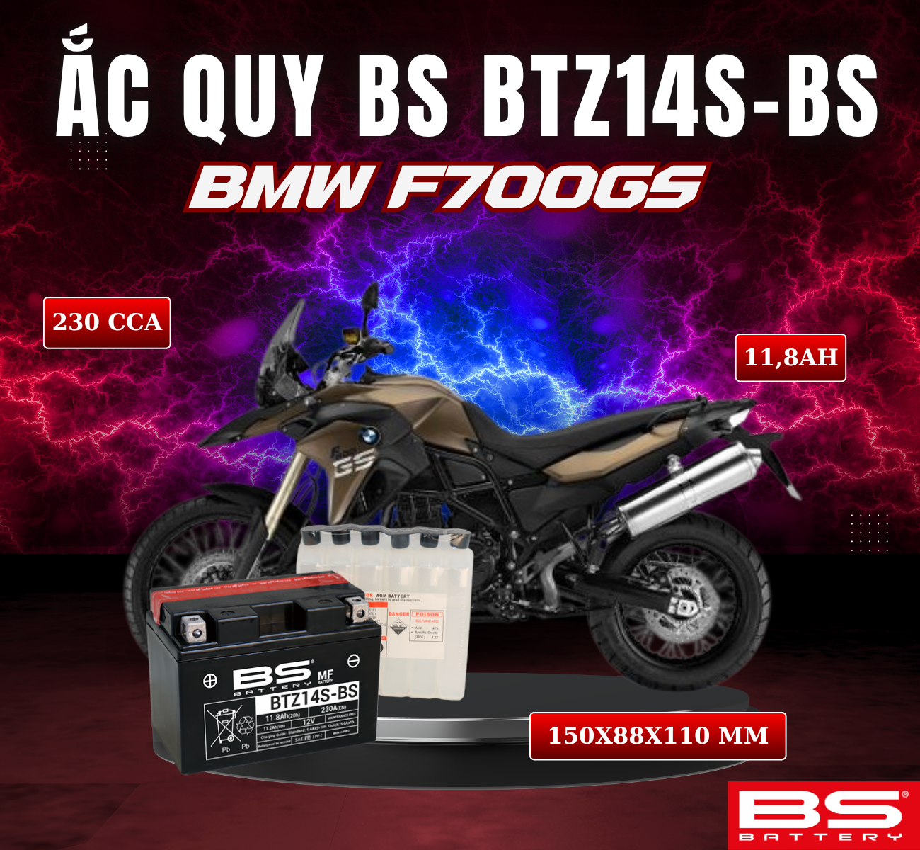 BÌNH ẮC QUY BS BTZ14-BS 230CCA BMW F700GS(150x88x110 mm)