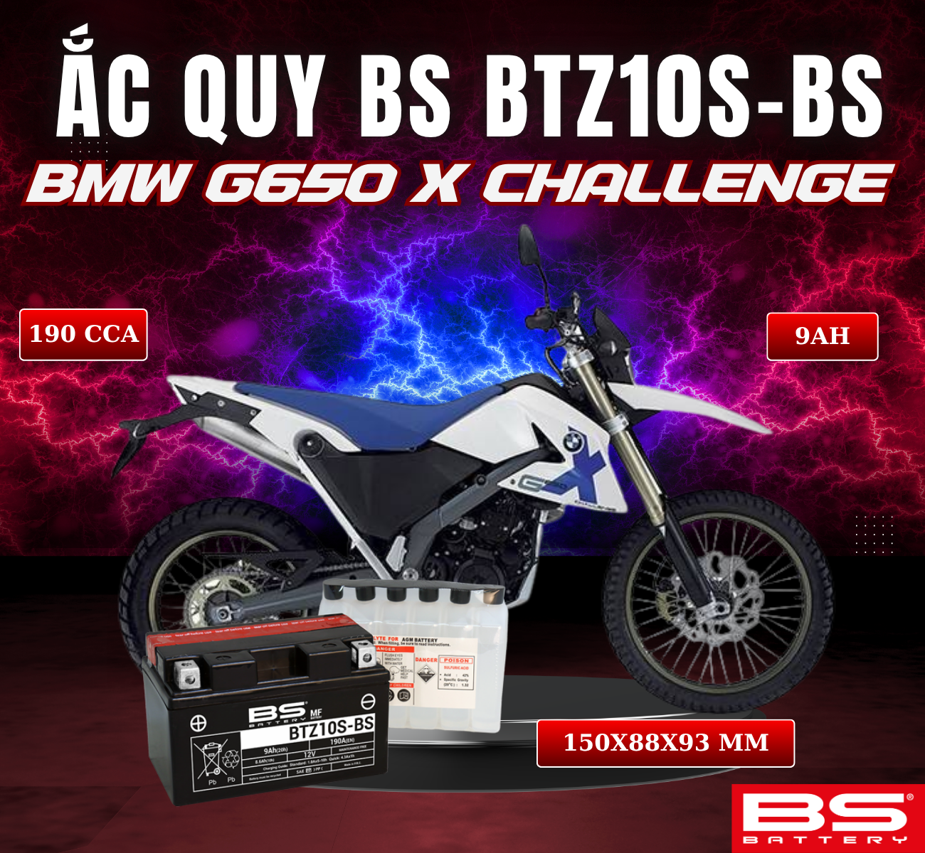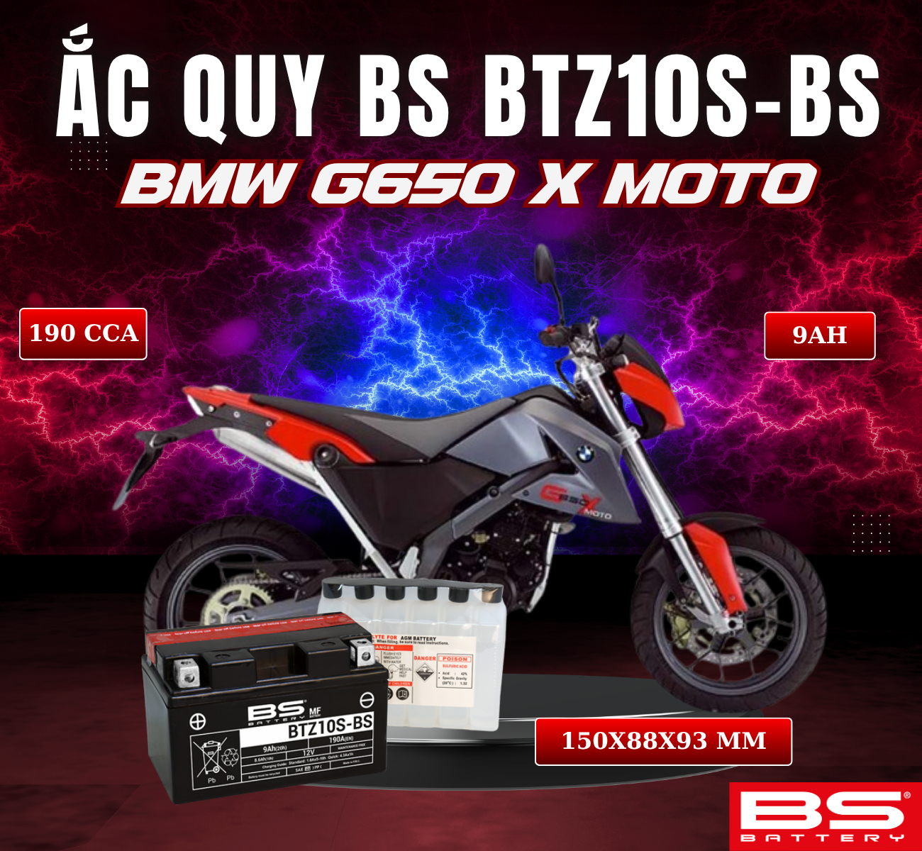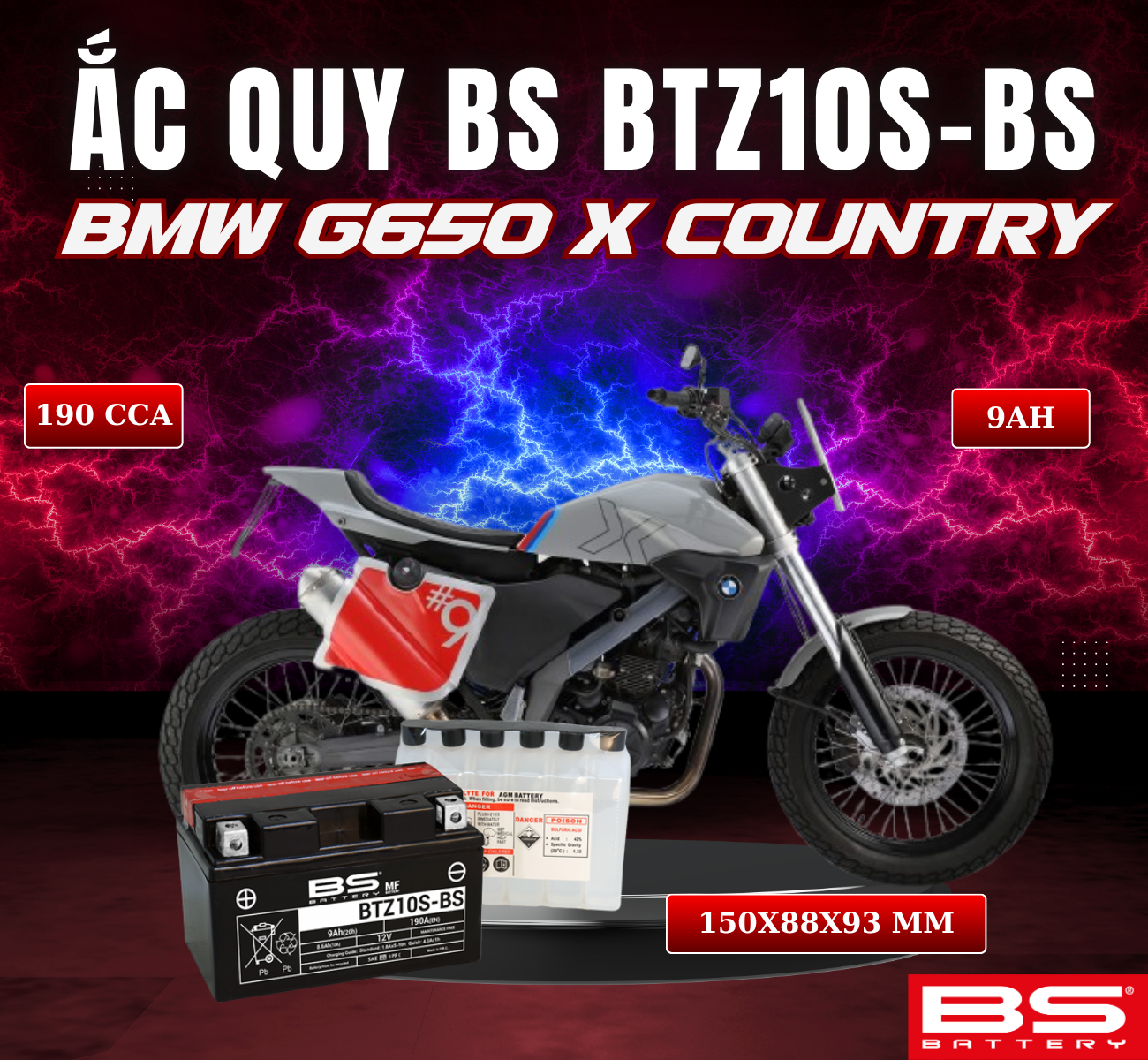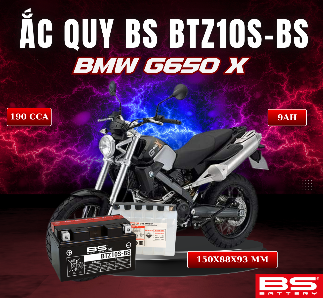 BÌNH ẮC QUY BS BATTERY BTZ10S-BS 190CCA BMW G650 X COUNTRY (150 x 88 x 93 mm)