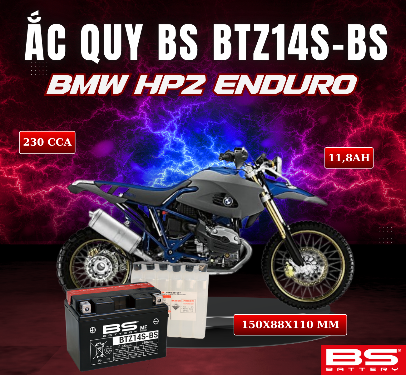 BÌNH ẮC QUY BS BTZ14-BS 230CCA BMW HP2 ENDURO(150x88x110 mm)