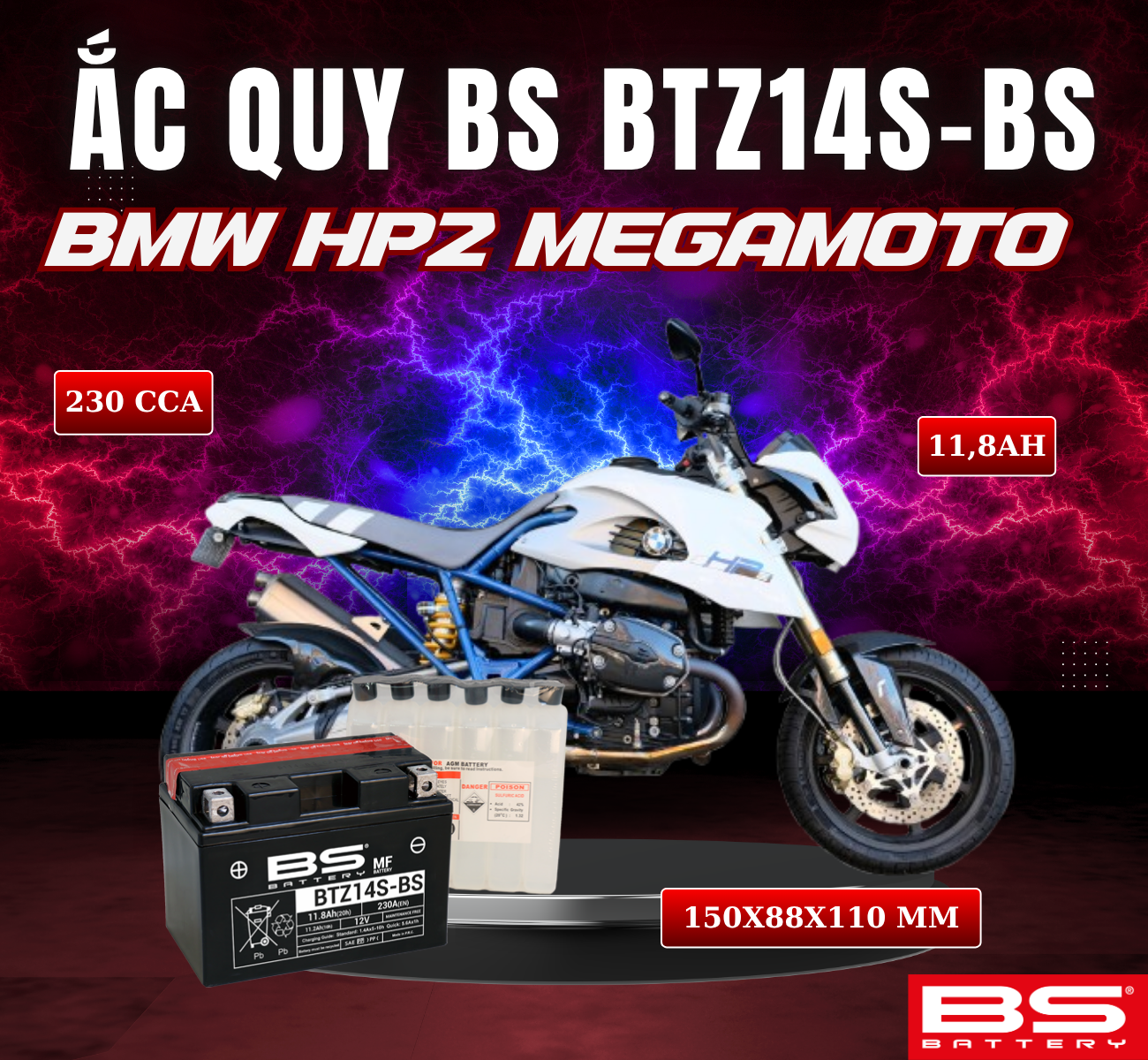 BÌNH ẮC QUY BS BTZ14-BS 230CCA BMW HP2 MEGAMOTO(150x88x110 mm)