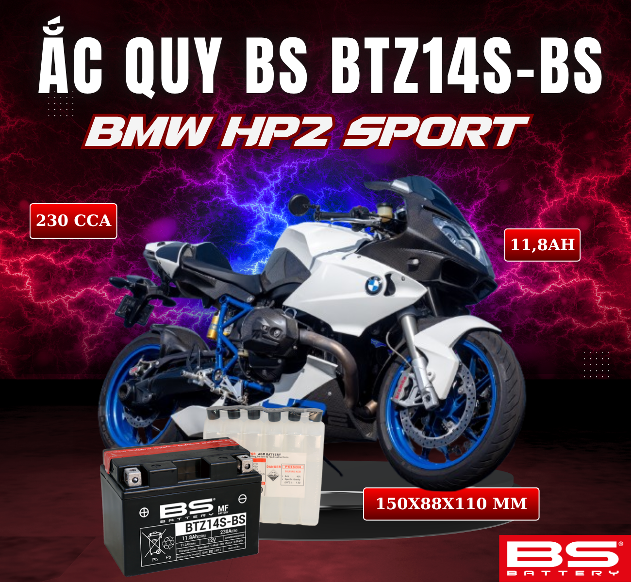 BÌNH ẮC QUY BS BTZ14-BS 230CCA BMW HP2 SPORT(150x88x110 mm)
