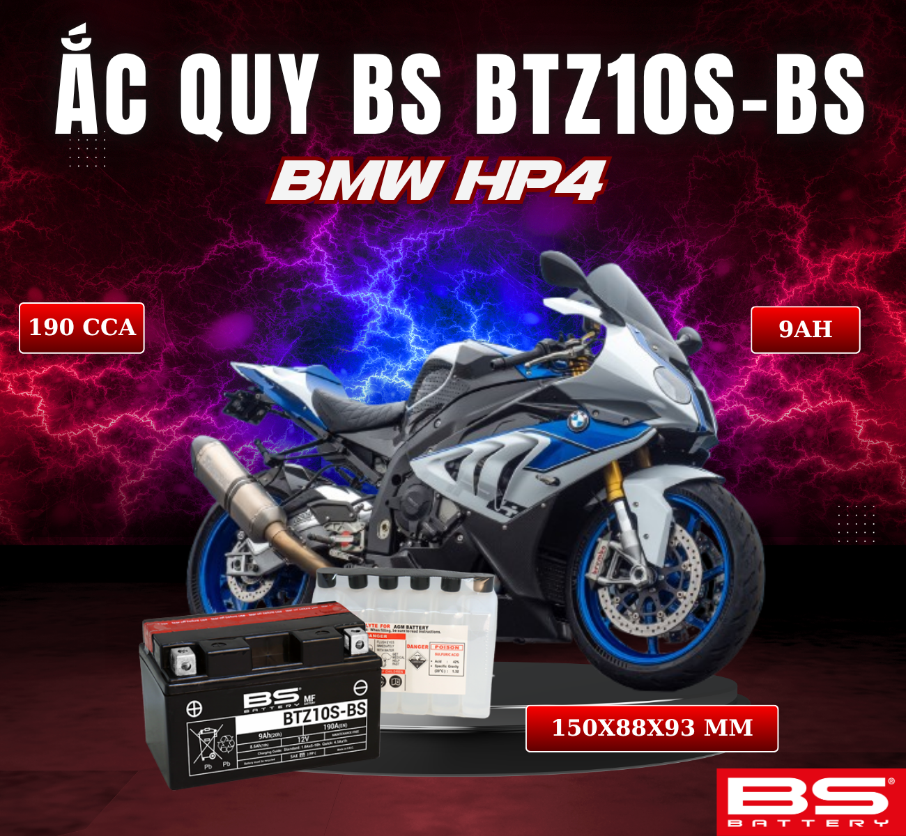 BÌNH ẮC QUY BS BATTERY BTZ10S-BS 190CCA BMW HP4 (150 x 88 x 93 mm)
