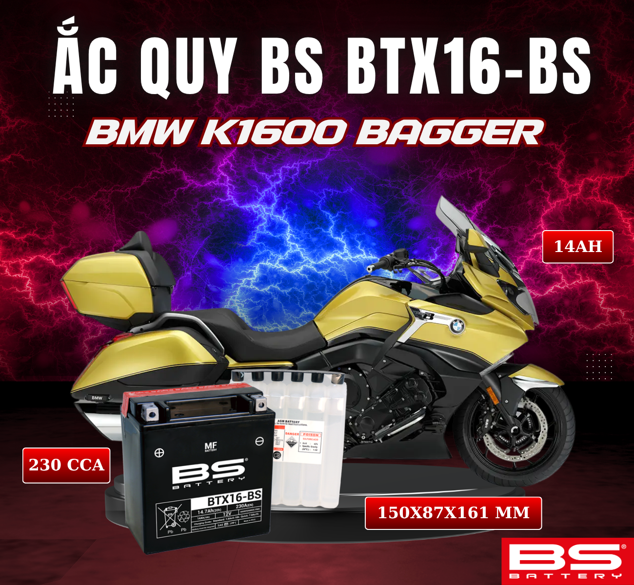 BÌNH ẮC QUY BS BTX16-BS 230CCA BMW K1600 BAGGER (150x 87x 161mm)
