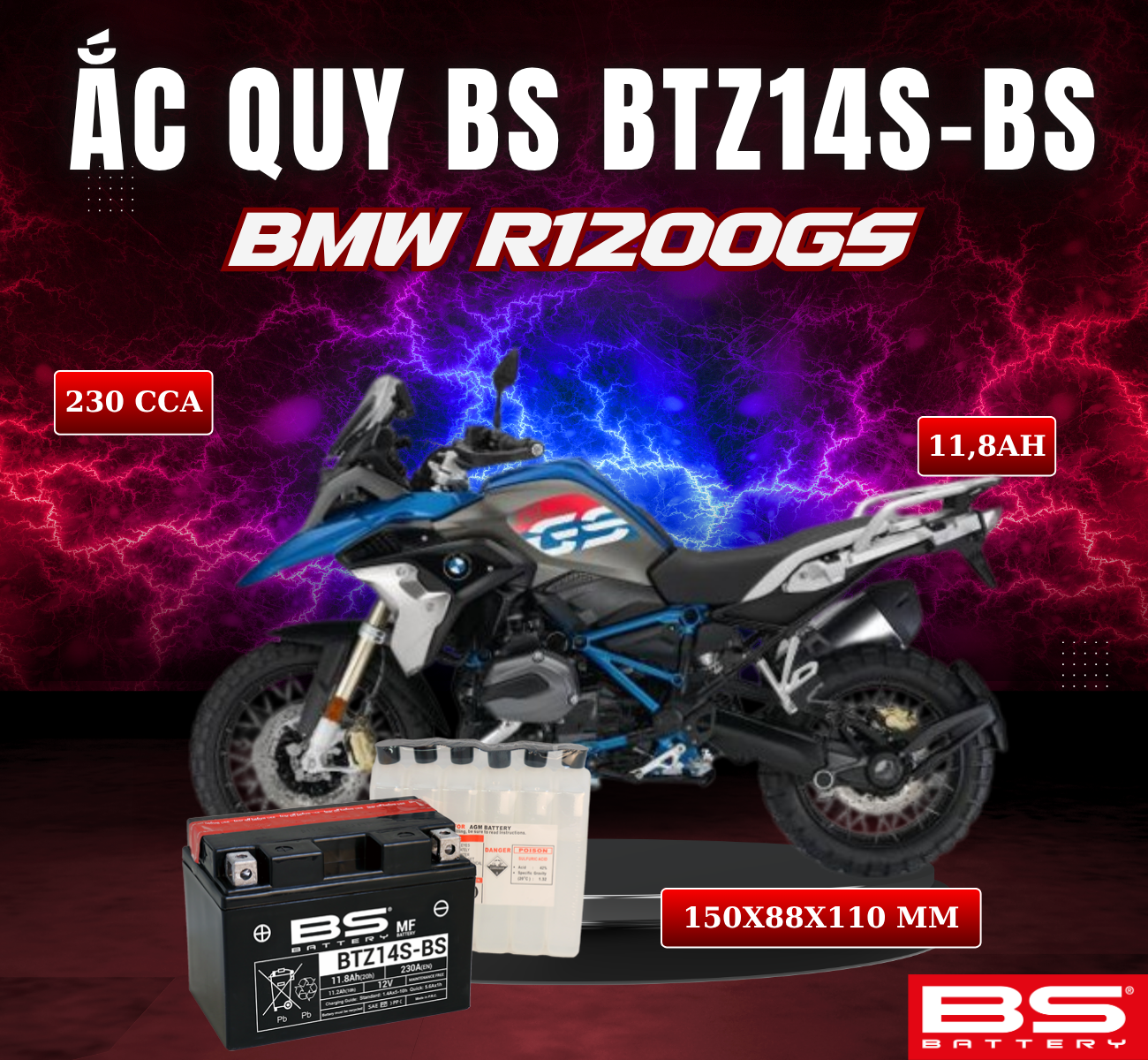 BÌNH ẮC QUY BS BTZ14-BS 230CCA BMW R1200GS(150x88x110 mm)