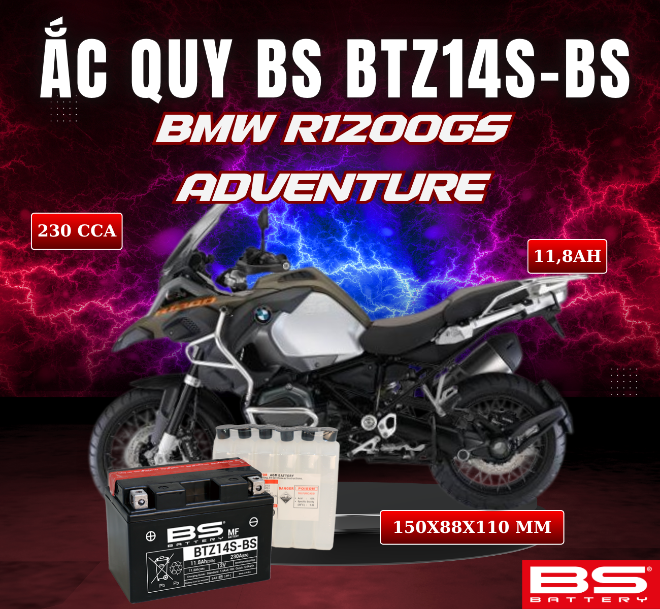 BÌNH ẮC QUY BS BTZ14-BS 230CCA BMW R1200GS ADVENTURE(150x88x110 mm)
