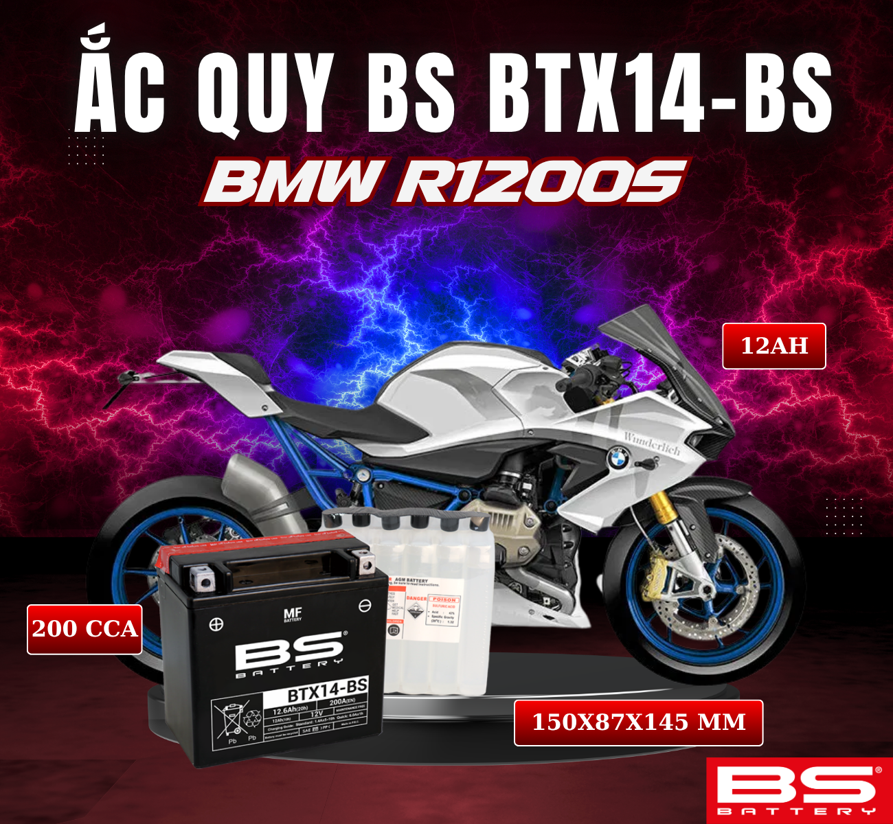 BÌNH ẮC QUY BS BTX14-BS 200CCA BMW R1200S (150x87x145 mm)