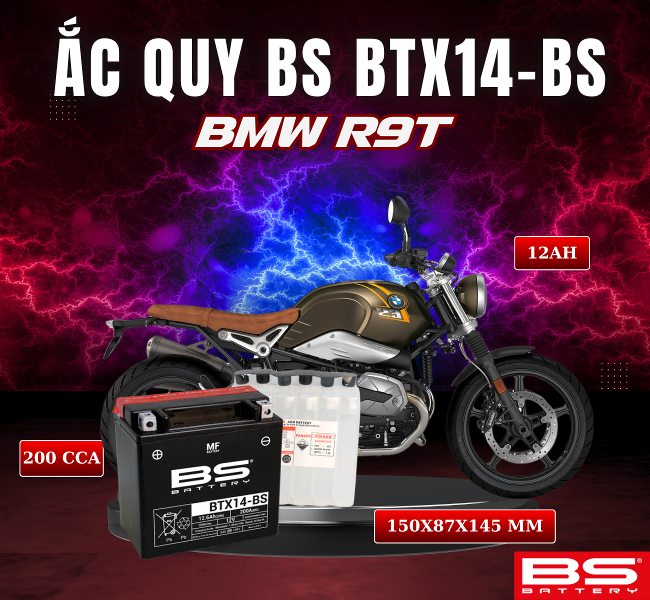 BÌNH ẮC QUY BS BTX14-BS 200CCA BMW R9T (150x87x145 mm)