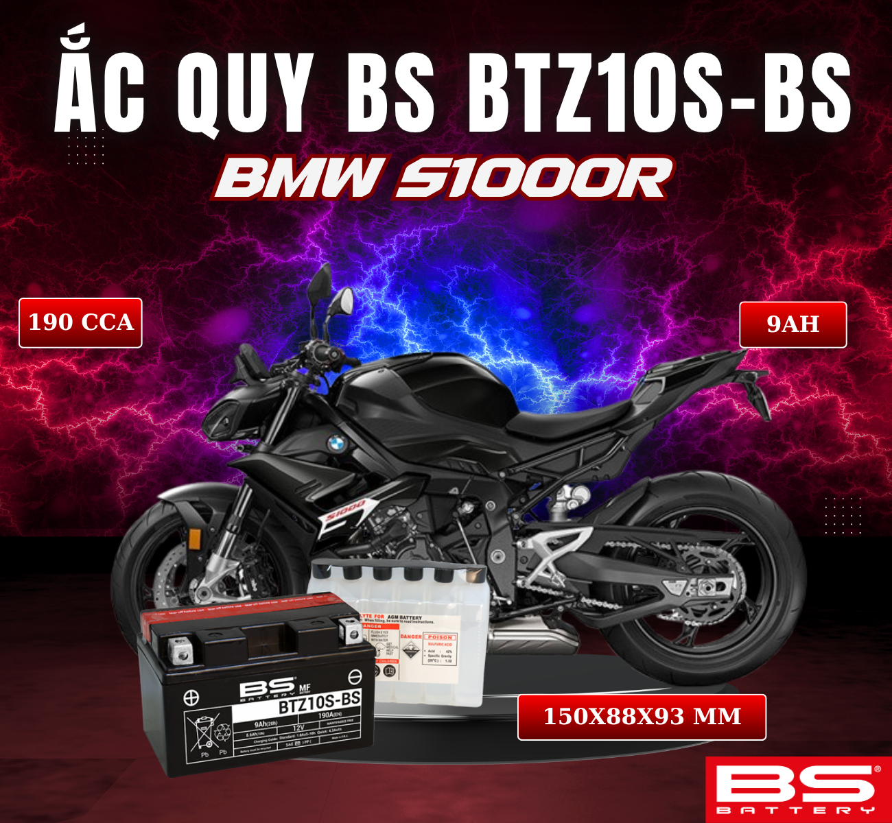 BÌNH ẮC QUY BS BATTERY BTZ10S-BS 190CCA BMW S1000R (150 x 88 x 93 mm)
