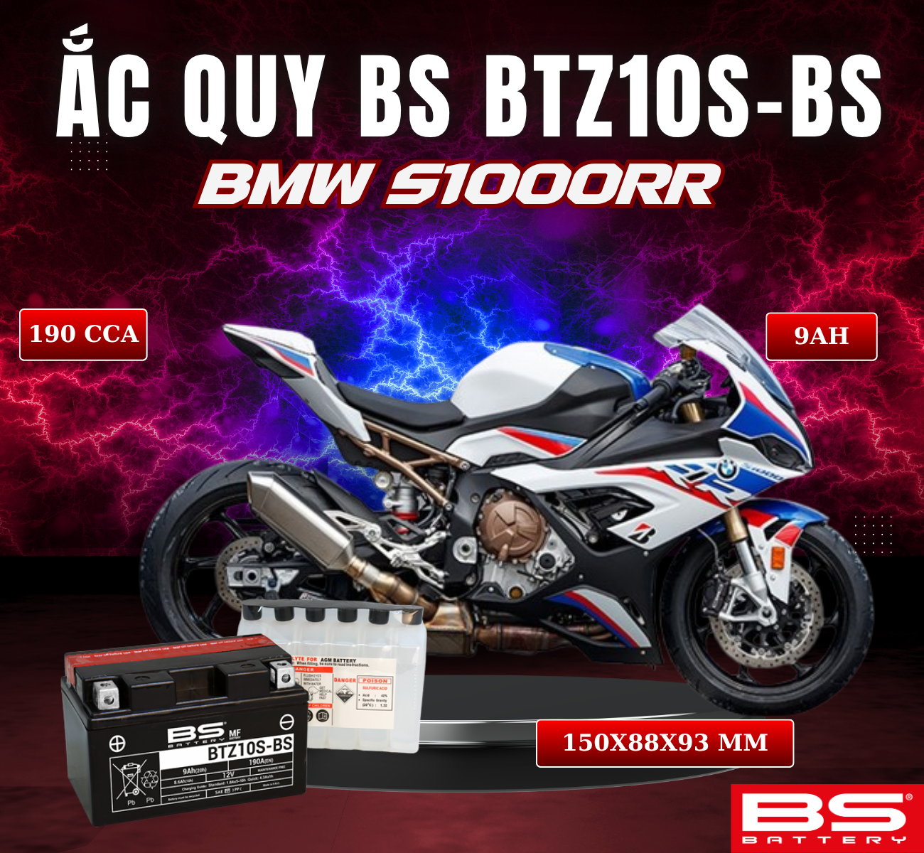 BÌNH ẮC QUY BS BATTERY BTZ10S-BS 190CCA BMW S1000RR (150 x 88 x 93 mm)