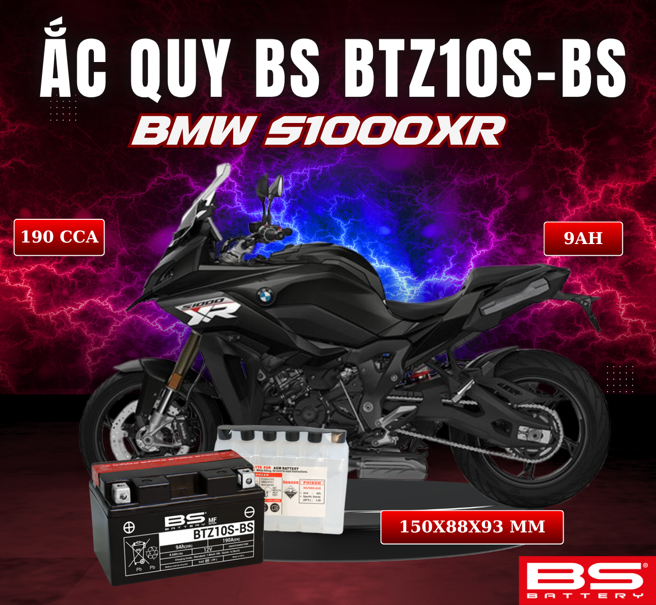 BÌNH ẮC QUY BS BATTERY BTZ10S-BS 190CCA BMW S1000XR (150 x 88 x 93 mm)