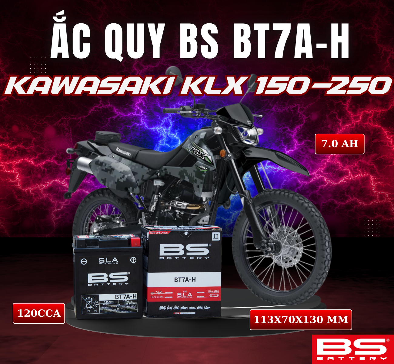 BÌNH ẮC QUY BS BT7A-H 120CCA KAWASAKI KLX 150-250 (113x70x130 mm)
