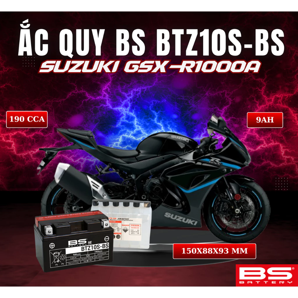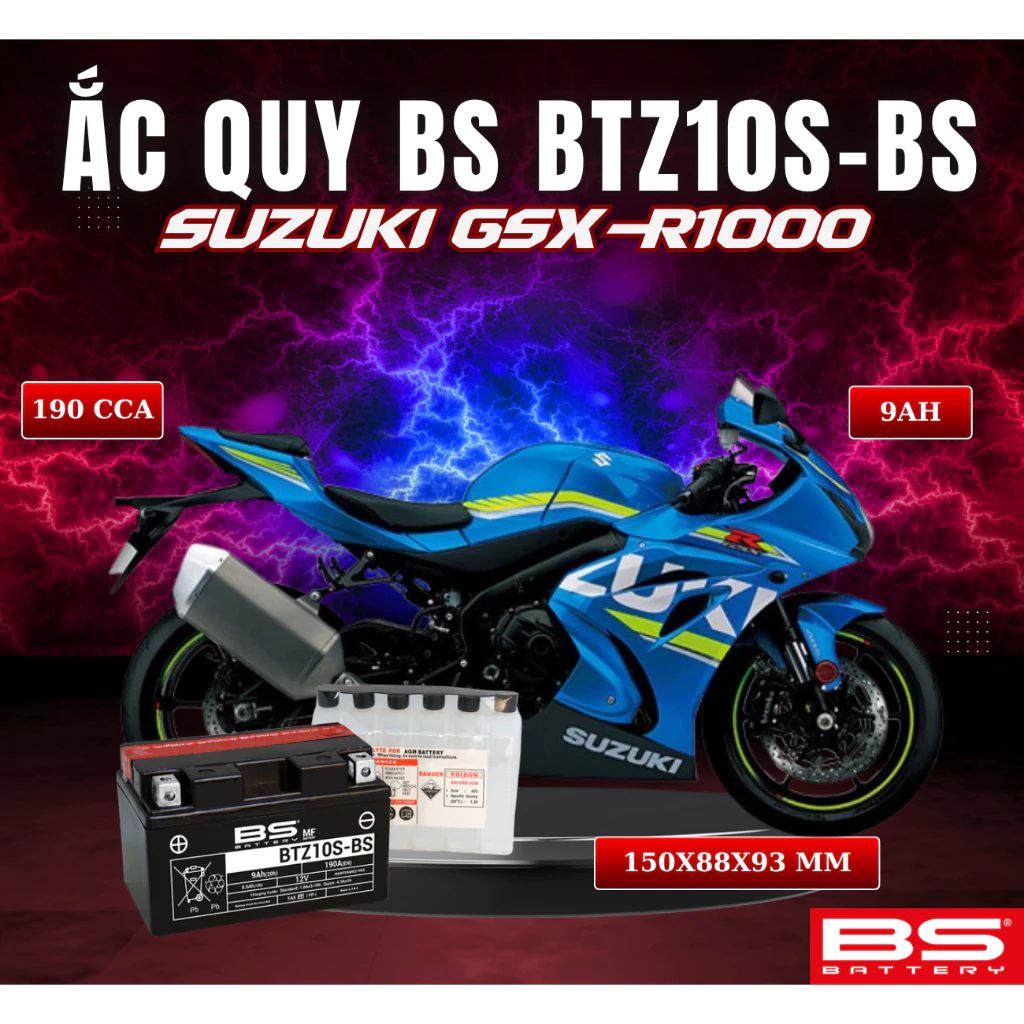 BÌNH ẮC QUY BS BATTERY BTZ10S-BS 190CCA SUZUKI GSX-R1000A (150 x 88 x 93 mm)