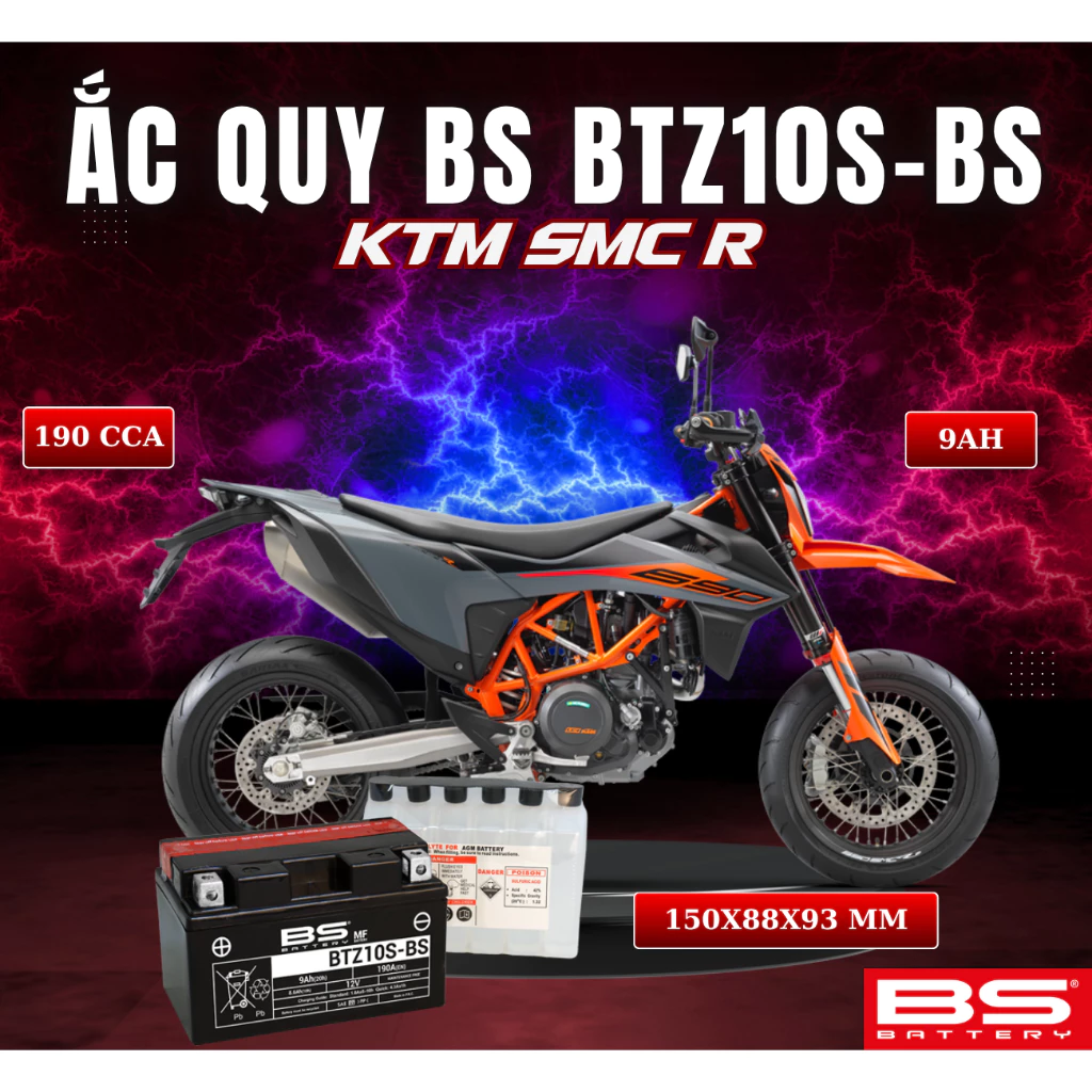 BÌNH ẮC QUY BS BATTERY BTZ10S-BS 190CCA KTM SMC R (150 x 88 x 93 mm)