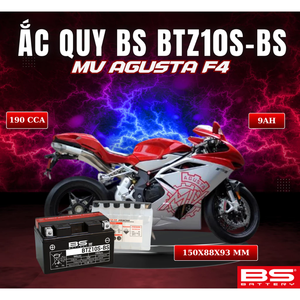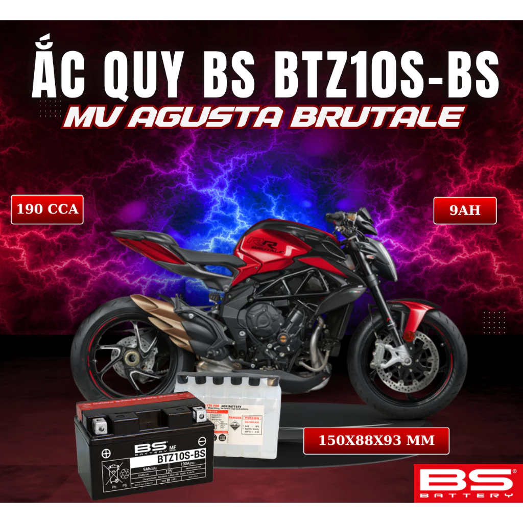 BÌNH ẮC QUY BS BATTERY BTZ10S-BS 190CCA MV AGUSTA BRUTALE (150 x 88 x 93 mm)