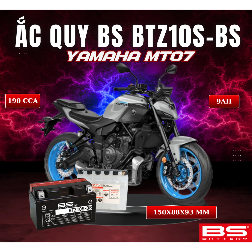 BÌNH ẮC QUY BS BATTERY BTZ10S-BS 190CCA YAMAHA MT07 (150 x 88 x 93 mm)