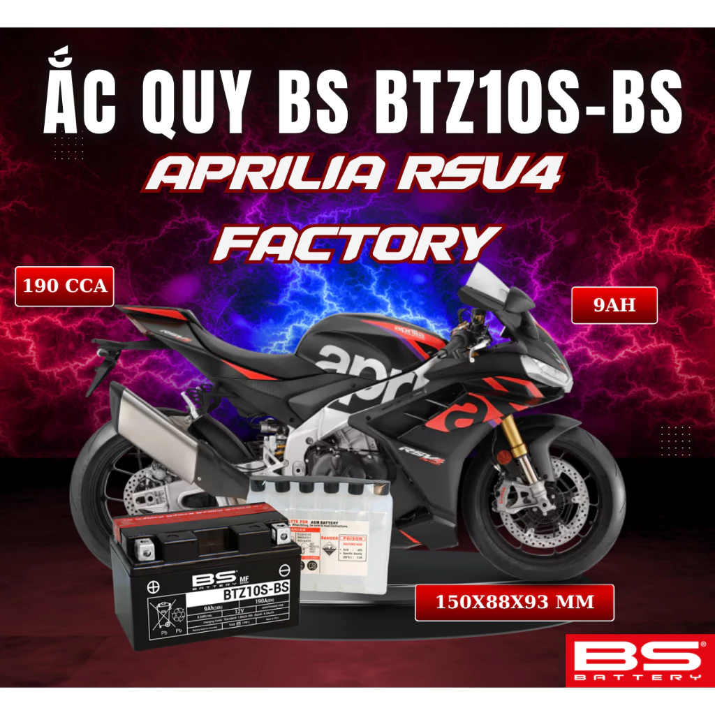 BÌNH ẮC QUY BS BATTERY BTZ10S-BS 190CCA APRILIA RSV4 FACTORY (150 x 88 x 93 mm)