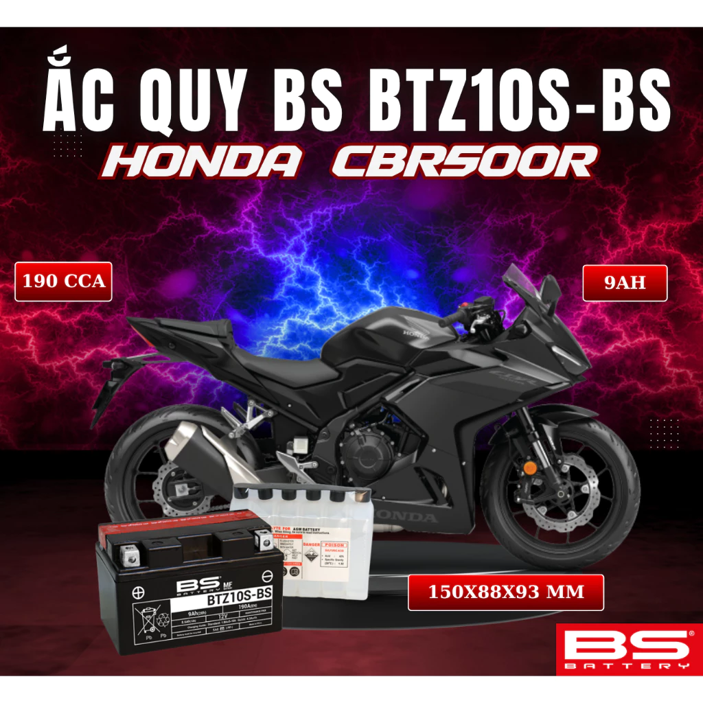 BÌNH ẮC QUY BS BATTERY BTZ10S-BS 190CCA HONDA CBR500R (150 x 88 x 93 mm)