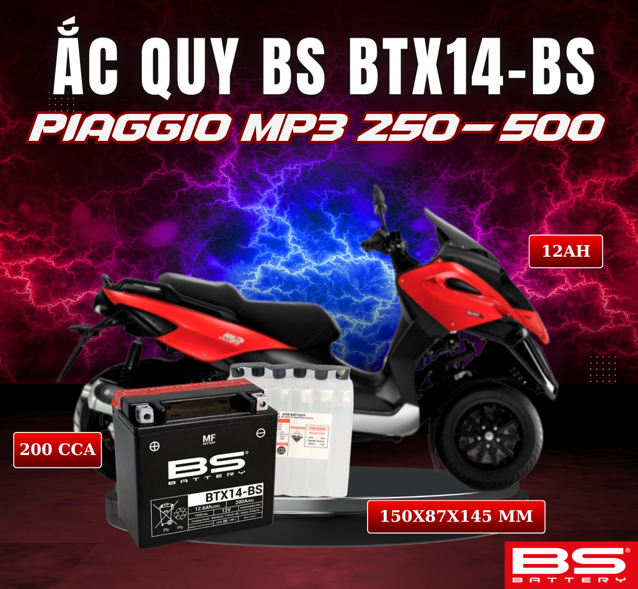 BÌNH ẮC QUY BS BTX14-BS 200CCA PIAGGIO MP3 250- 500 (150x87x145 mm)