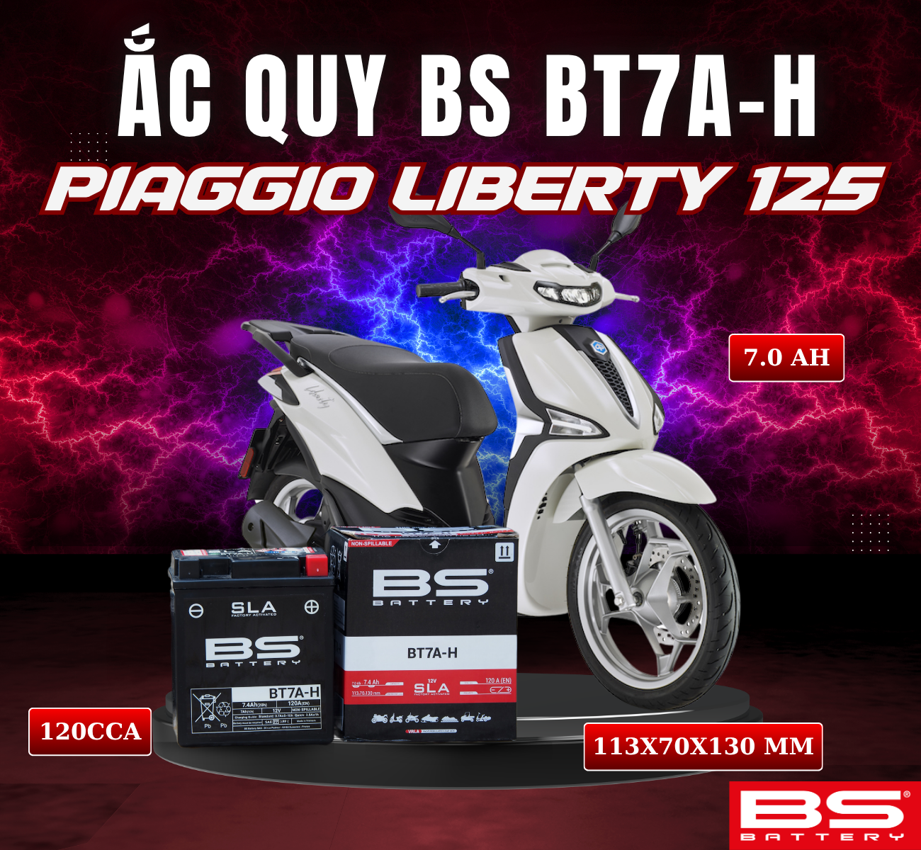 BÌNH ẮC QUY BS BT7A-H 120CCA PIAGGIO VESPA LX 125 (113x70x130 mm)