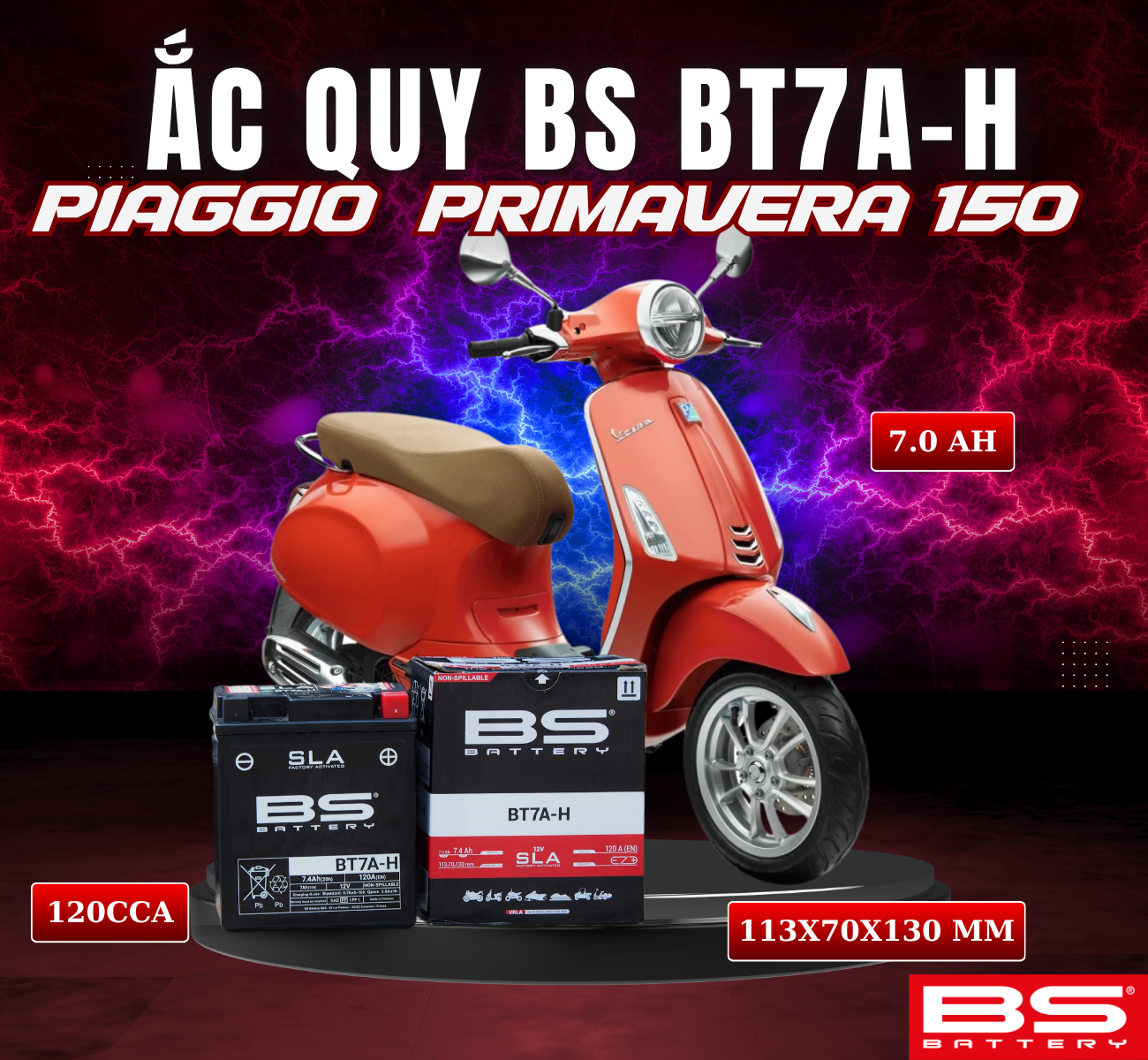 BÌNH ẮC QUY BS BT7A-H 120CCA PIAGGIO PRIMAVERA 150 (113x70x130 mm)
